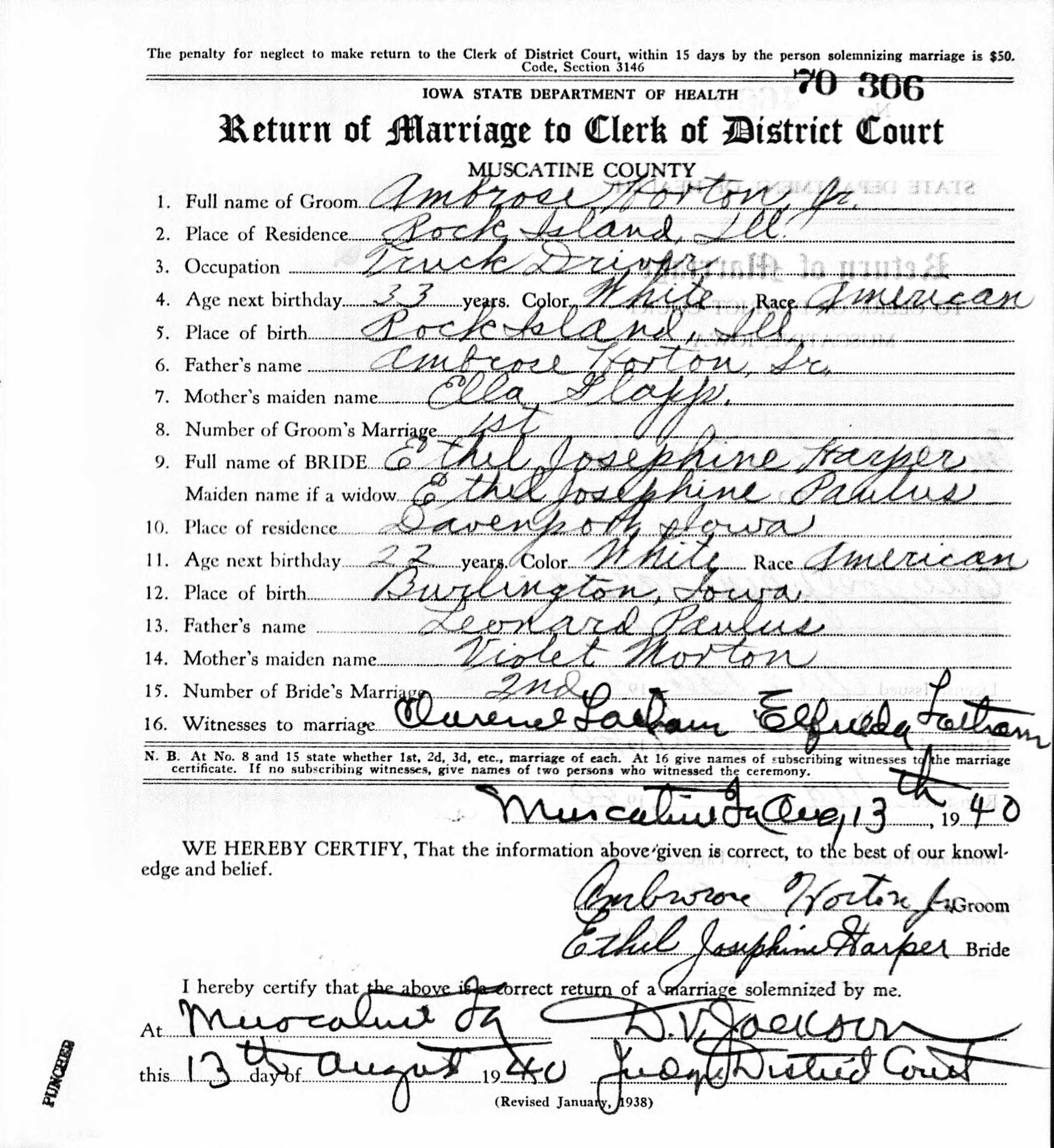 | Daughter | Ethel Josephine Paulus Born: June 17, 1919, Died: July 8, 2006 |