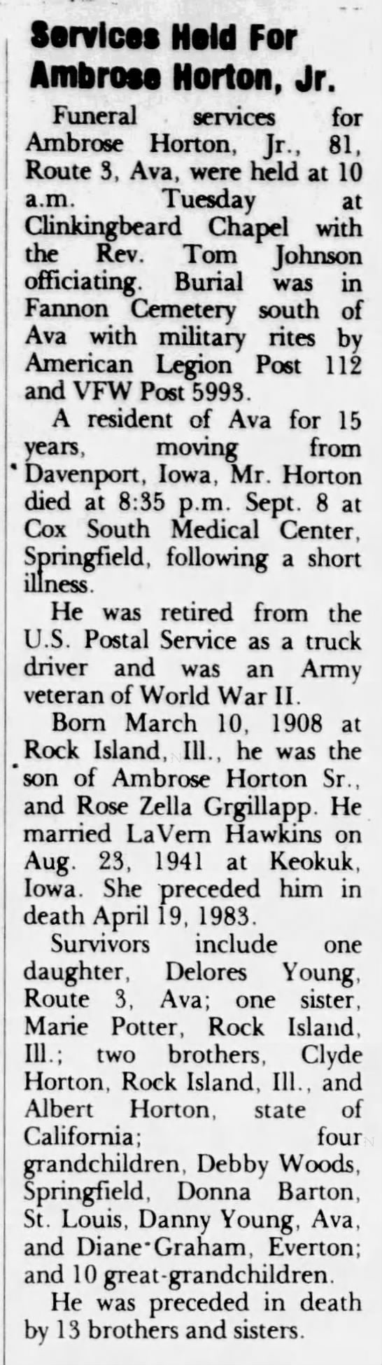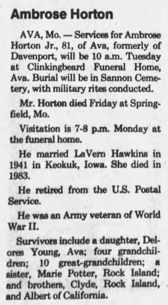 | Father | Ambrose Horton, Sr. Born: August 5, 1871, Died: April 27, 1957 |