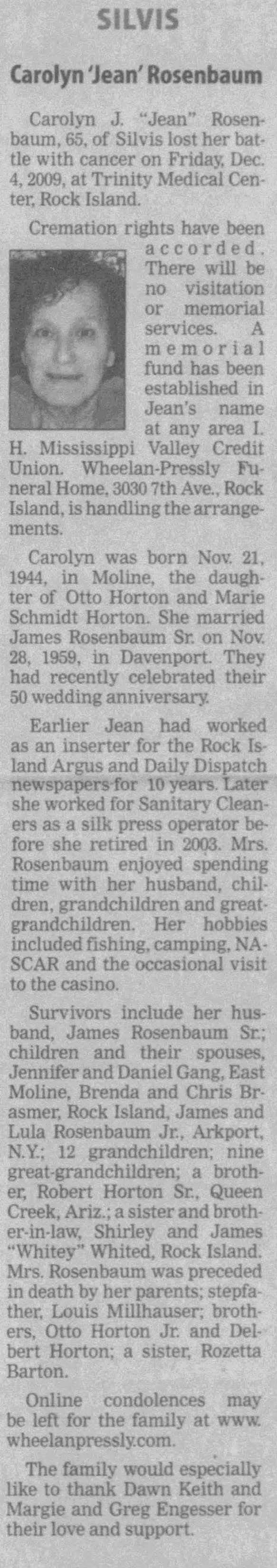 James Rosenbaum, Sr., were married on November 28, 1959 in Davenport, Scott, Iowa, USA. She died on December 4, 2009, at age 65, in Rock Island, Rock Island, Illinois, USA. She was buried in Cremation.