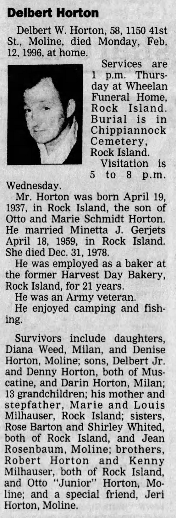 Delbert Wayne Horton was born on April 19, 1937 in Rock Island, Rock Island, Illinois, USA. He and