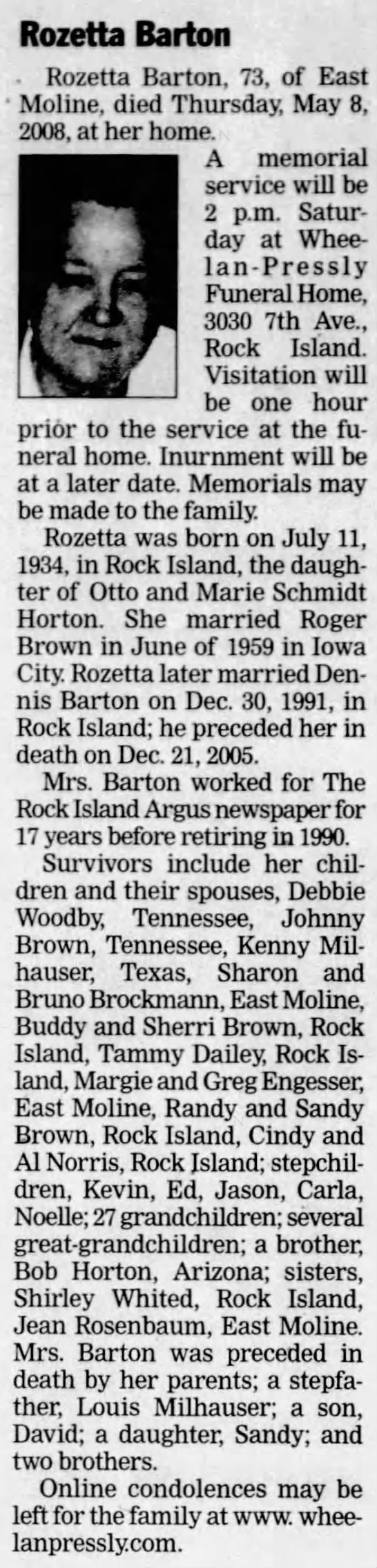 Dennis Harry Barton were married on December 30, 1991 in Rock Island, Rock Island, Illinois, USA. She died on May 8, 2008, at age 73, in East Moline, Rock Island, Illinois, USA. She was buried in Chippiannock Cemetery, Rock Island, Illinois.