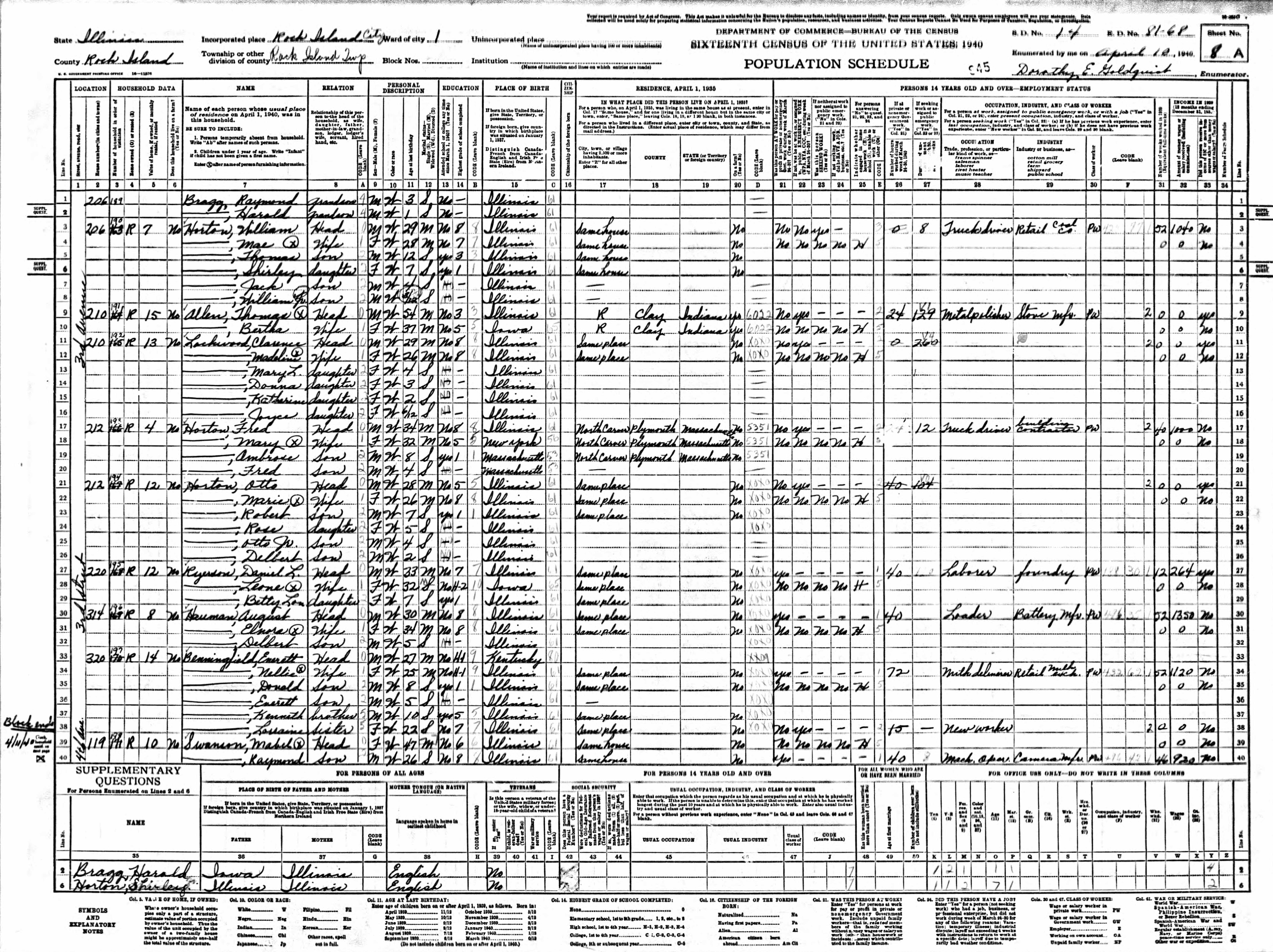 Horton Family 1940 Federal Census Illinois, Lines 17-26