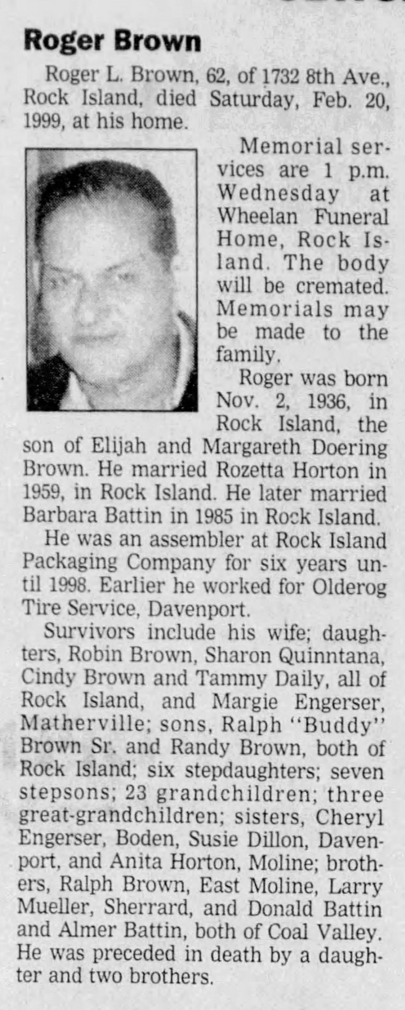 Roger LaVerne Brown was born on November 2, 1936 in Rock Island, Rock Island, Illinois, USA. He and