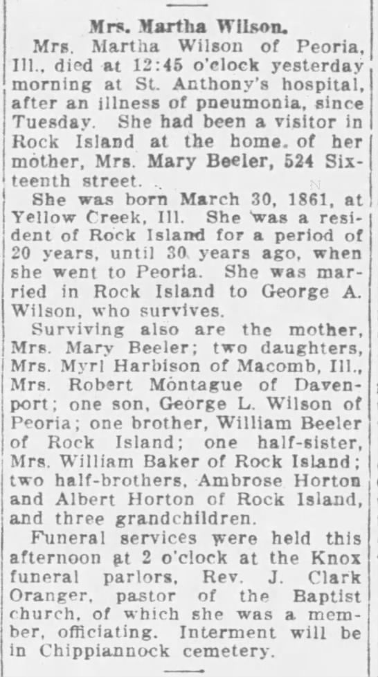 George Asell Wilson were married in 1884. She died on March 14, 1920, at age 58, in Rock Island, Rock Island, Illinois, USA. She was buried in Chippiannock Cemetery, Rock Island, Illinois.