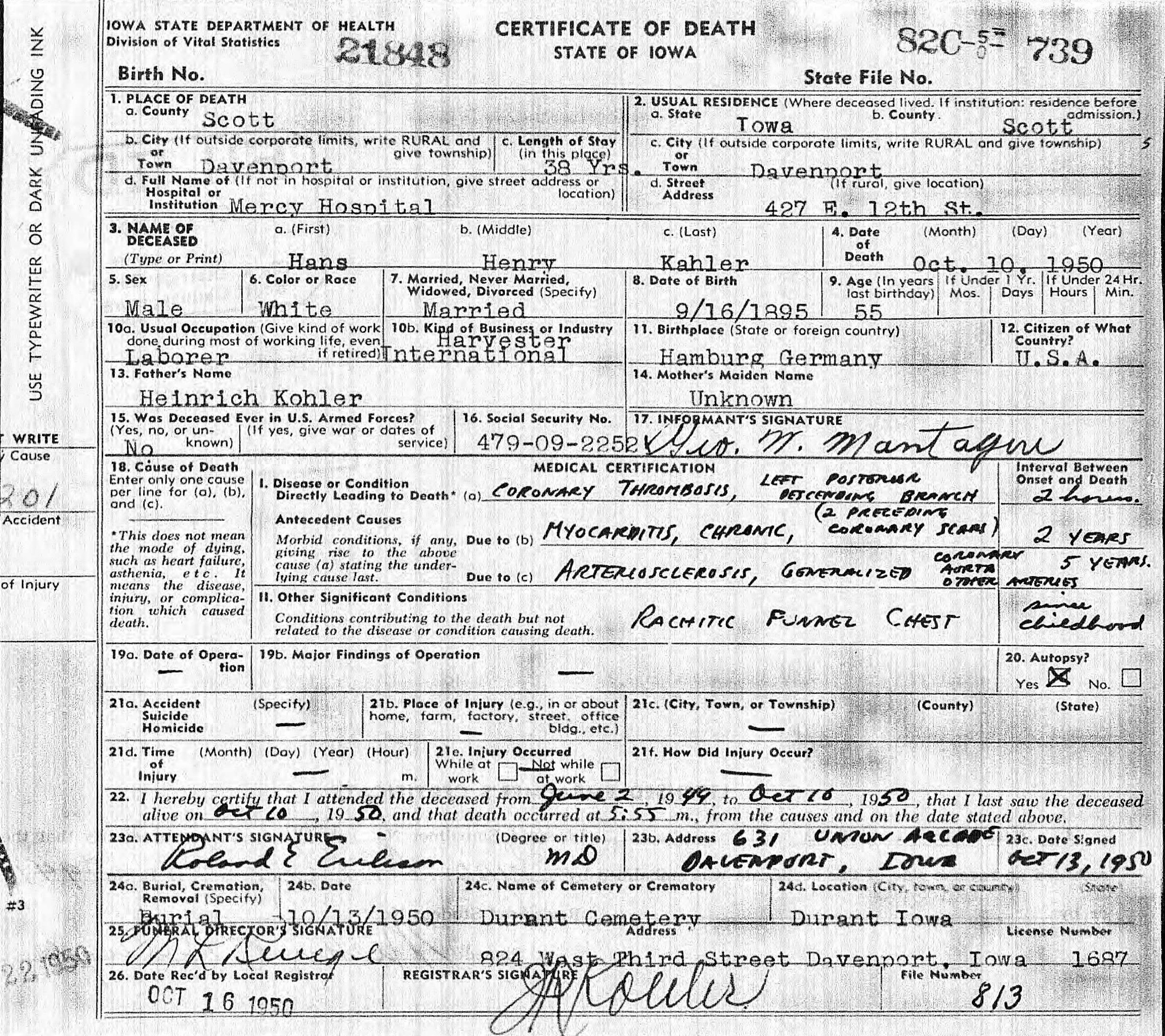 Hans Heinrich Kahler were married in 1937. She died on January 11, 1972, at age 79, in Davenport, Scott, Iowa, USA. She was buried in Durant Cemetery, Durant, Iowa.