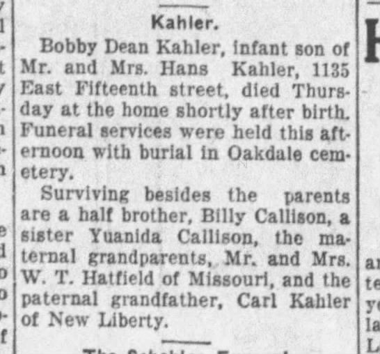 Bobby Dean Kahler was born on January 30, 1930 in Davenport, Scott, Iowa, USA. He died on January 30, 1930, at age 0, in Davenport, Scott, Iowa, USA. He was buried in Oakdale Memorial Gardens, Davenport, Iowa.