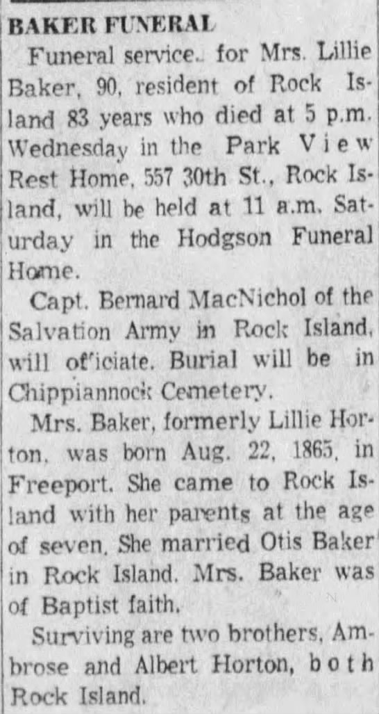 Miniotan "Otis" Baker were married on May 22, 1890 in Freeport, Stephenson, Illinois, USA. She died on February 28, 1956, at age 90, in Rock Island, Rock Island, Illinois, USA. She was buried in Chippiannock Cemetery, Rock Island, Illinois.