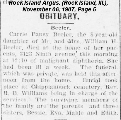 Carrie Pansy Beeler was born in 1899 in Rock Island National Cemetery, Rock Island, Illinois. She died on November 6, 1907, at age ~8, in Rock Island National Cemetery, Rock Island, Illinois. She was buried in Chippiannock Cemetery, Rock Island, Illinois.