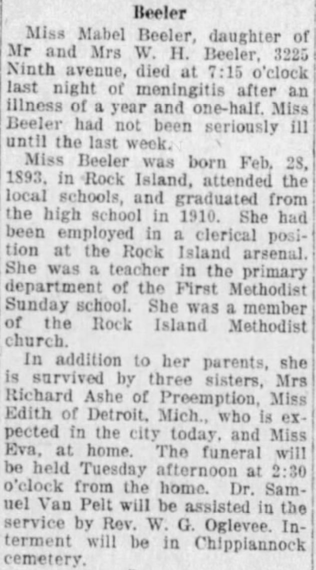 Mabel Beeler was born on February 28, 1893 in Rock Island National Cemetery, Rock Island, Illinois. She died on February 15, 1920, at age 26, in Rock Island National Cemetery, Rock Island, Illinois. She was buried in Chippiannock Cemetery, Rock Island, Illinois.