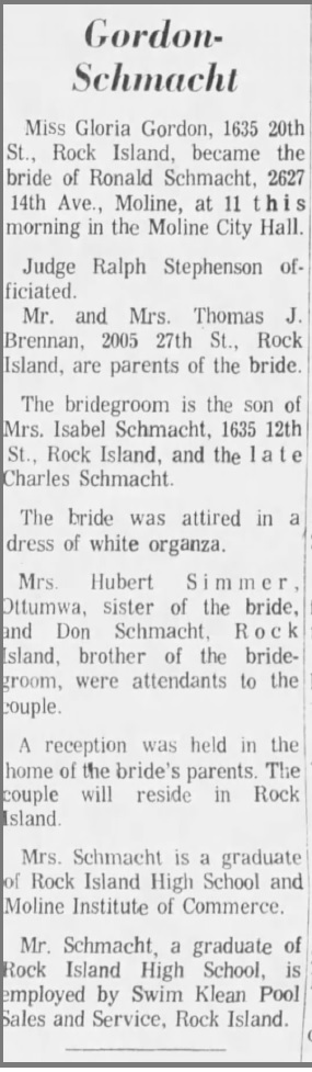 Carol Jane Schmacht were married in May 1959 in Rock Island, Rock Island, Illinois, USA. He died on May 11, 1992, at age 62, in Milan, Rock Island, Illinois, USA. He was buried in Rock Island National Cemetery, Rock Island, Illinois.
