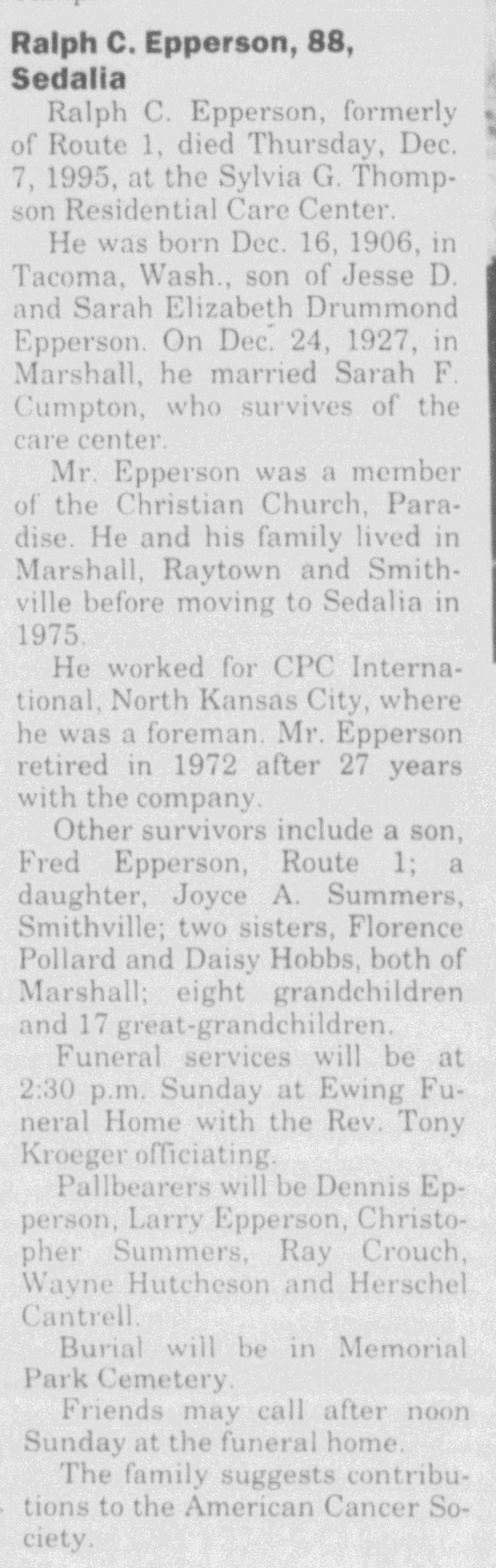 Sarah Frances Cumpton were married on December 24, 1927 in Marshall, Saline, Missouri, USA. He died on December 7, 1995, at age 88, in Sedalia, Pettis, Missouri, USA. He was buried in Memorial Park Cemetery, Sedalia, Missouri.