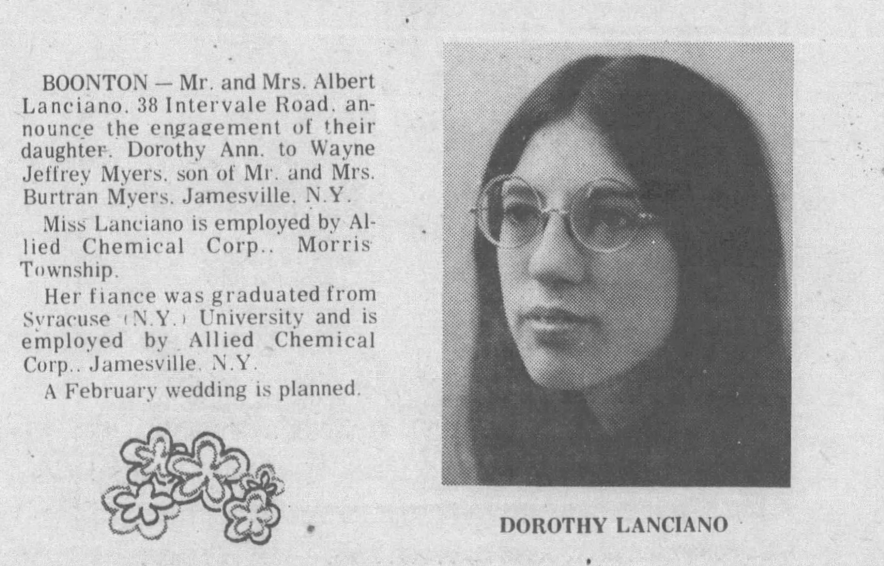 Dororthy Ann Lanciano were married on February 15, 1975 in Boonton, Morris, New Jersey, USA.