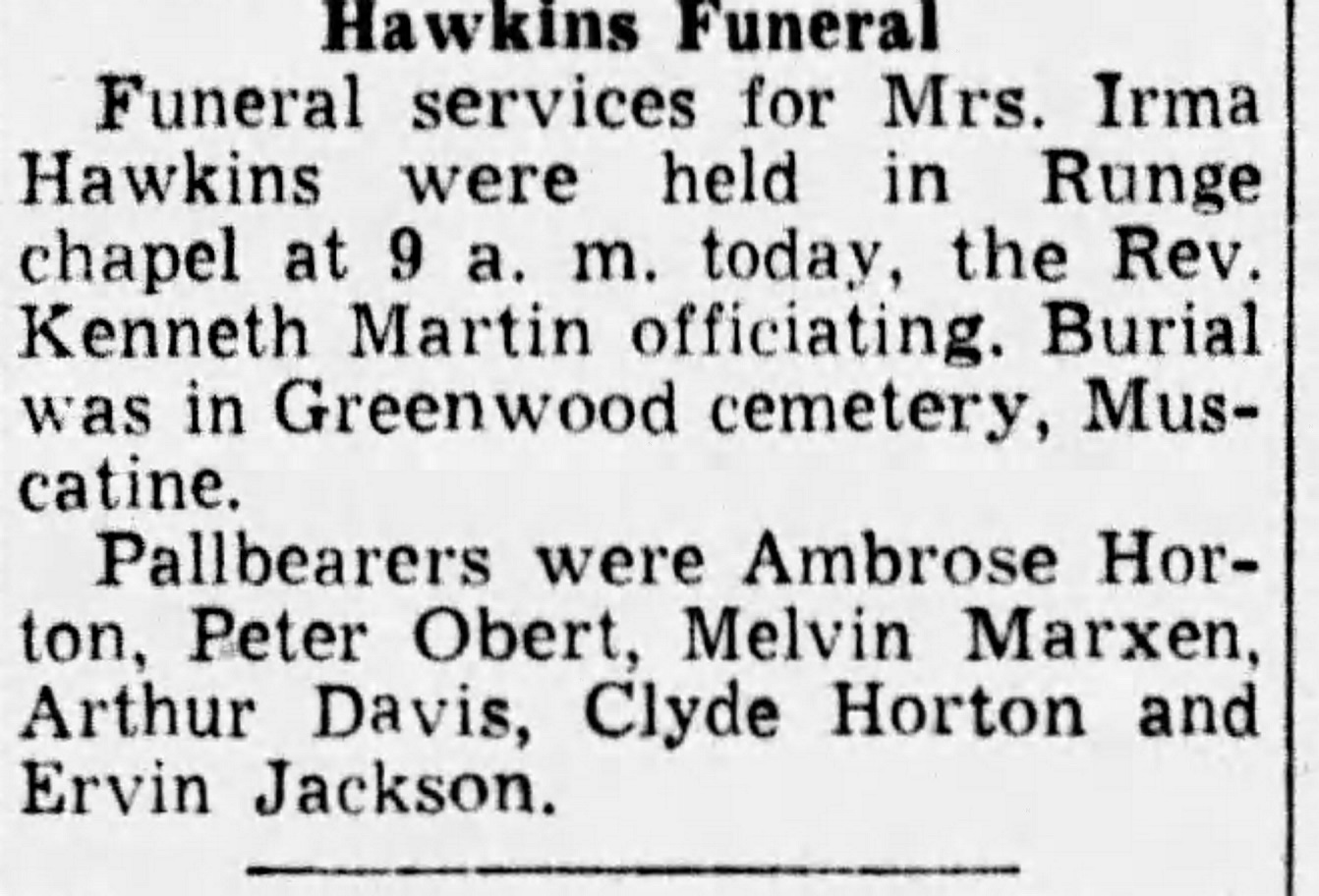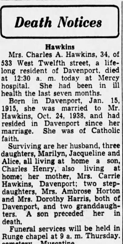 Charles Henry Hawkins, Sr., were married on October 24, 1938 in Wapello, Louisa, Iowa, USA. She died on June 28, 1949, at age 34, in Davenport, Scott, Iowa, USA. She was buried in Greenwood Cemetery, Muscatine, Iowa.