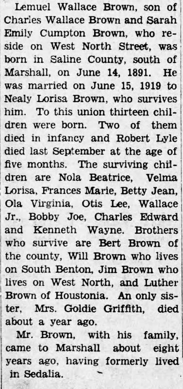Lemuel Wallace Brown was born on June 14, 1891 in Saline, Missouri, USA. He and