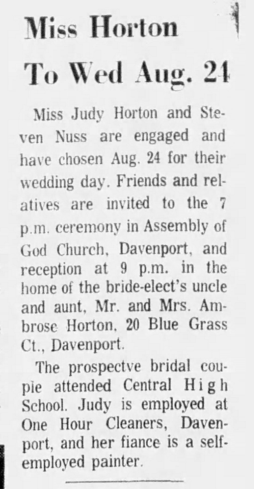 Judy Horton were married on August 24, 1968 in Davenport, Scott, Iowa, USA.