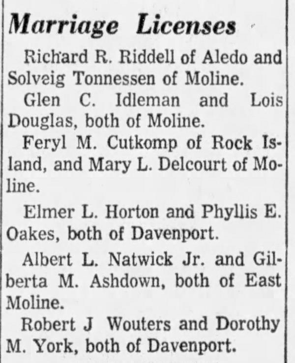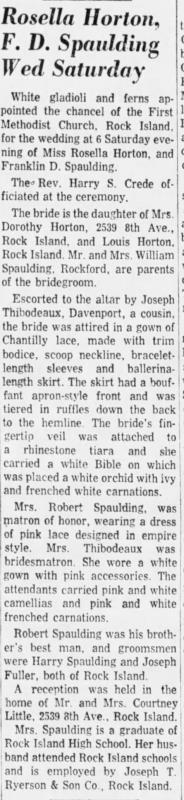 Florence Rosella Horton were married on August 13, 1960 in Rock Island, Rock Island, Illinois, USA.