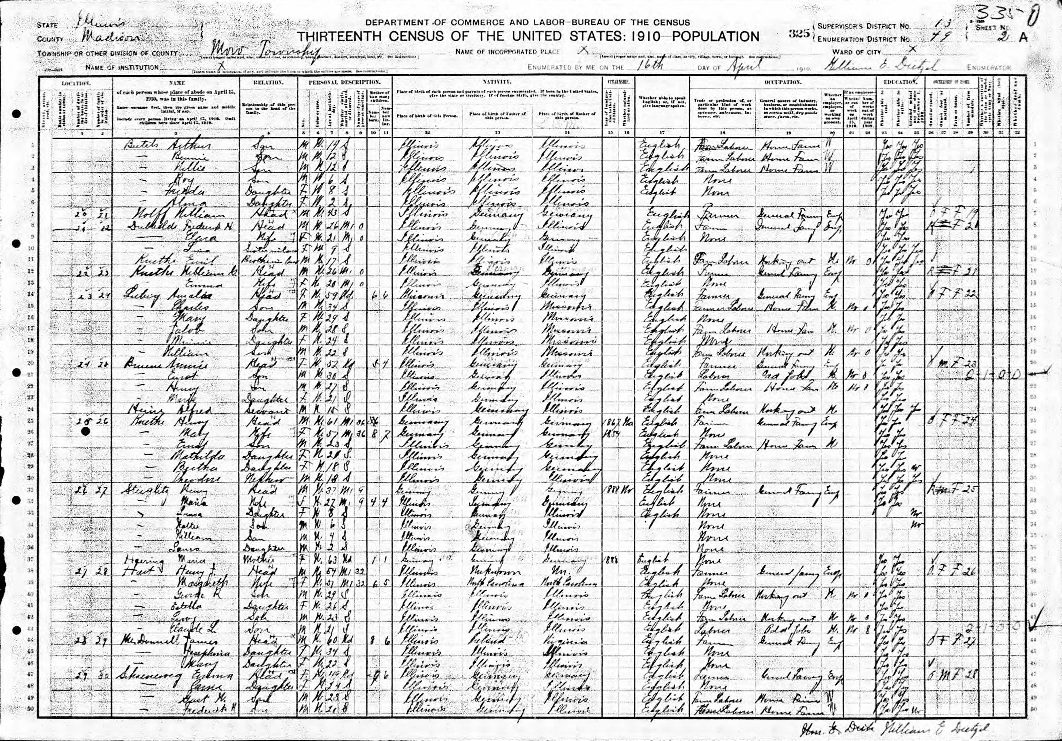 Kuethe Family 1910 Federal Census Illinois, Lines 25-30