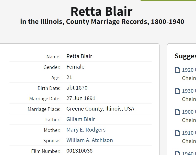 Chelnissa M. "Retta" Blair were married on June 27, 1891 in Greene, Illinois, USA. He died on January 20, 1942, at age 81, in Granite City, Madison, Illinois, USA. He was buried in Sunset Hill Cemetery, Glen Carbon, Illinois.