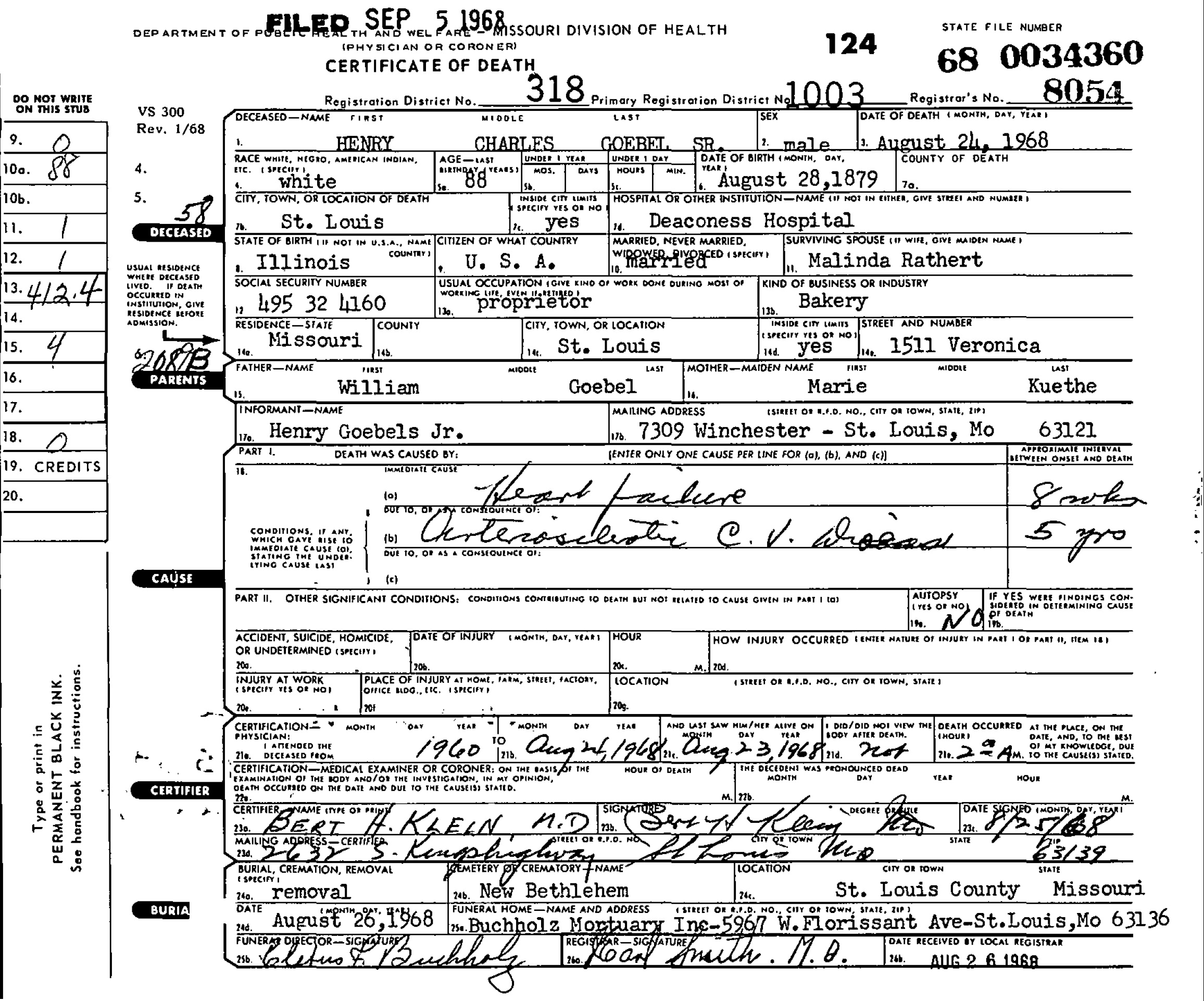 Malinda E. Rathert were married. He died on August 24, 1968, at age 88, in St. Louis, Missouri, USA. He was buried in New Bethlehem Memorial Park Cemetery, St. Louis, Missouri.