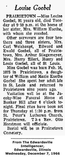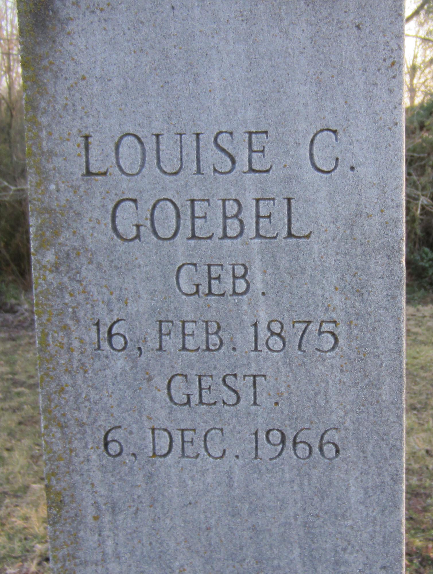 Louise C. Goebel was born on February 16, 1875 in Prairietown, Madison, Illinois, USA. She died on December 6, 1966, at age 91, in Prairietown, Madison, Illinois, USA. She was buried in Prairietown Cemetery, Prairietown, Illinois.