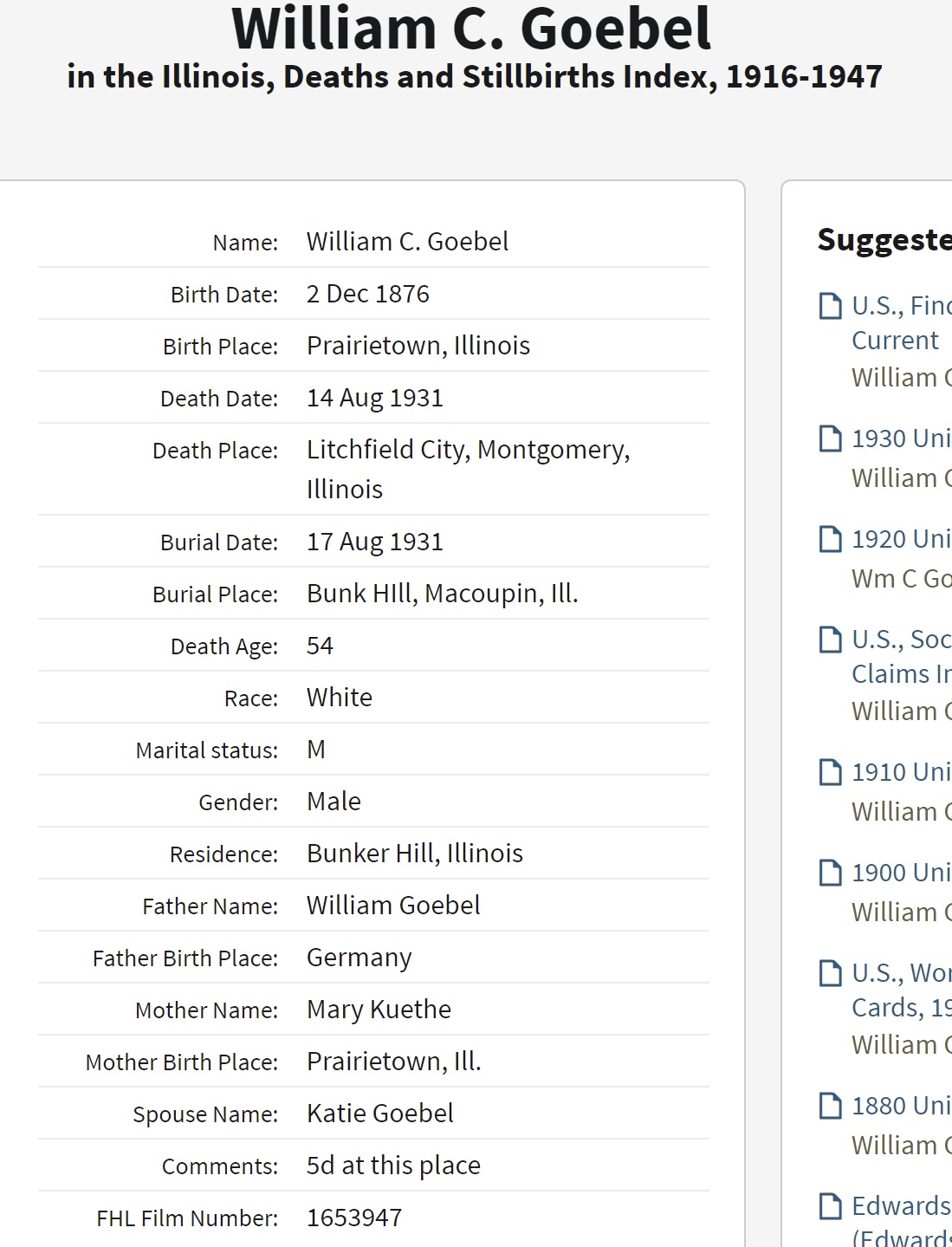 William C. Goebel, Sr., was born on December 2, 1876 in Prairietown, Madison, Illinois, USA. He and