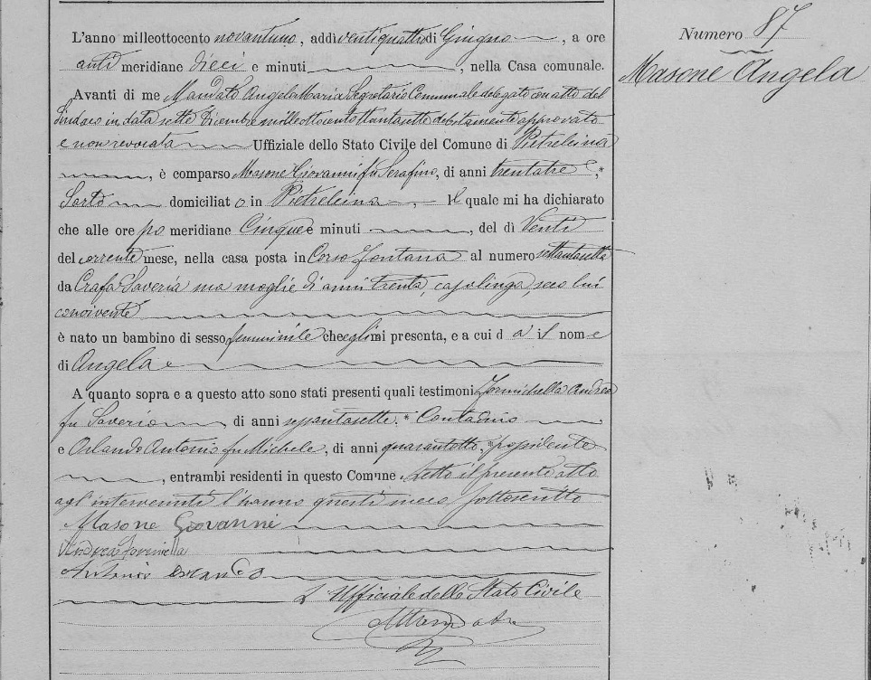 Angela Maria Masone was born on July 10, 1892 in Pietrelcina, Benevento, Campania, Italy. She and