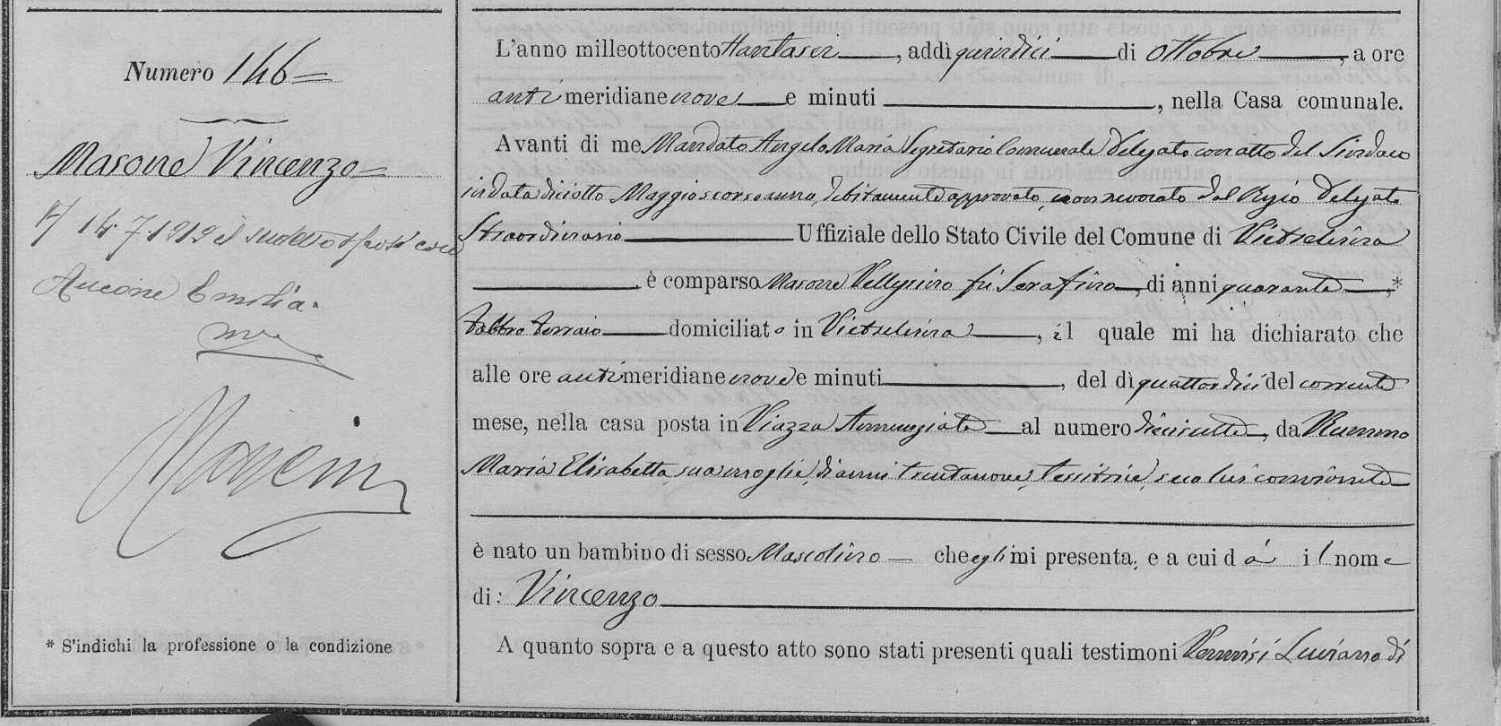 Vincenzo Masone was born on October 15, 1886 in Pietrelcina, Benevento, Campania, Italy. He and