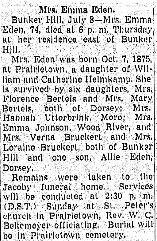 Henry F. Eden were married on October 12, 1893. She died on July 8, 1949, at age 73, in Bunker Hill, Macoupin, Illinois, USA. She was buried in Prairietown Cemetery, Prairietown, Illinois.