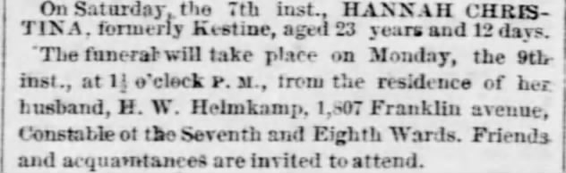 Hanna Christine Kastien was born on February 23, 1845 in Germany. She and