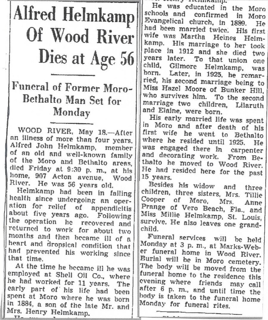 Alfred John Helmkamp was born on December 2, 1884 in Moro, Madison, Illinois, USA. He and