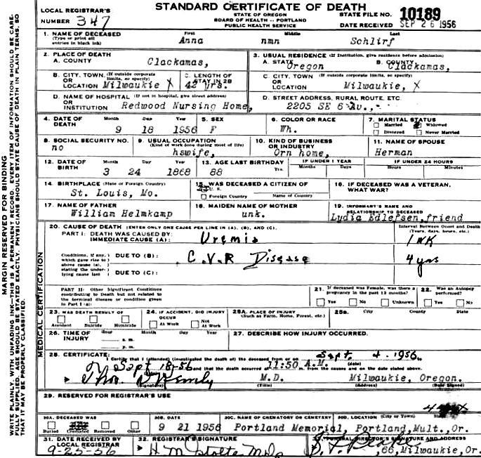 Herman Joseph Schlirf were married on April 11, 1894 in Macoupin, Illinois, USA. She died on September 18, 1956, at age 88, in Milwaukie, Clackamas, Oregon, USA. She was buried in Wilhelm's Portland Memorial Mausoleum, Portland, Oregon.