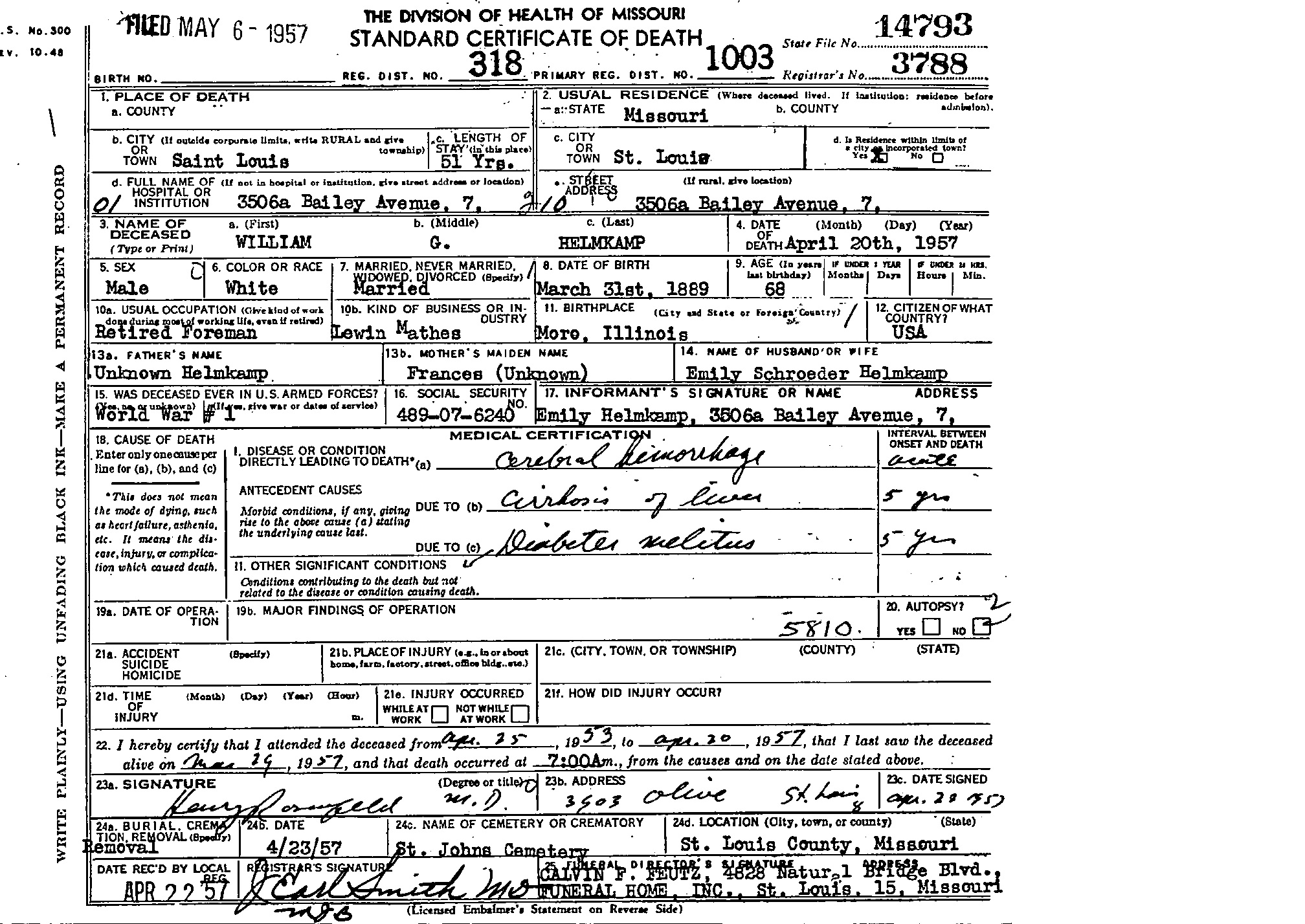 Emily Lilie Maria Schroeder were married on February 21, 1923 in St. Louis, Missouri, USA. He died on April 20, 1957, at age 68, in St. Louis, Missouri, USA. He was buried in St. Johns Cemetery, Bellefontaine, Missouri.