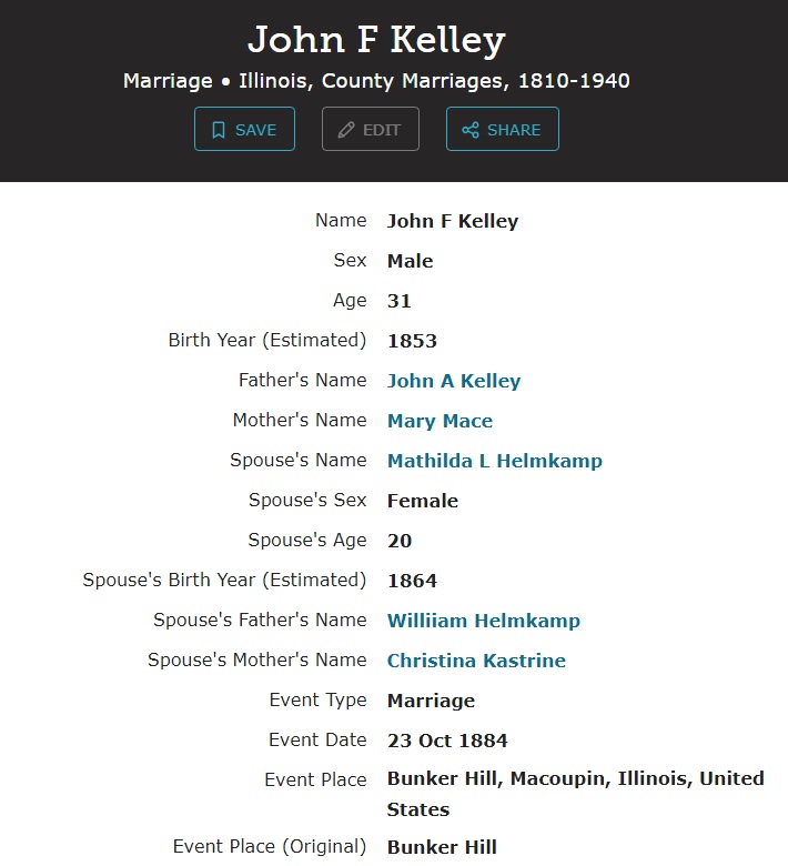 John Thomas Kelly were married on October 23, 1884 in Bunker Hill, Macoupin, Illinois, USA. She died on April 9, 1936, at age 71. She was buried in Lakewood Park Cemetery, Affton, MIssouri.