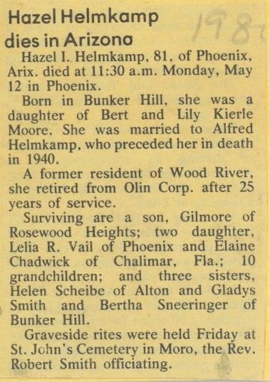 Gilmore Helmkamp were married on March 27, 1937 in Staunton, Macoupin, Illinois, USA. She died on February 28, 2007, at age 96, in Alton, Madison, Illinois, USA. She was buried in Moro Cemetery, Moro, Illinois.