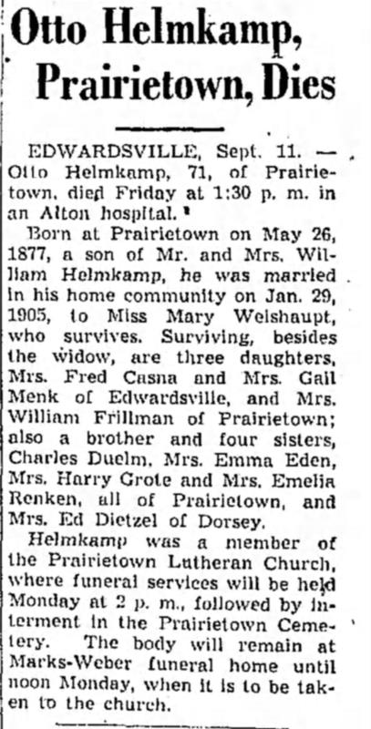 Otto Helmkamp was born on May 26, 1877 in Prairietown, Madison, Illinois, USA. He and