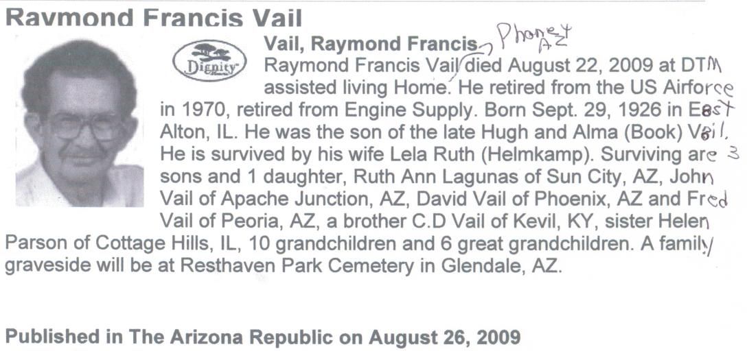 Raymond Francis Vail was born on September 29, 1926 in East Alton, Madison, Illinois, USA. He died on August 22, 2009, at age 82, in Sun City, Maricopa, Arizona, USA. He was buried in West Resthaven Park Cemetery, Glendale, Arizona.