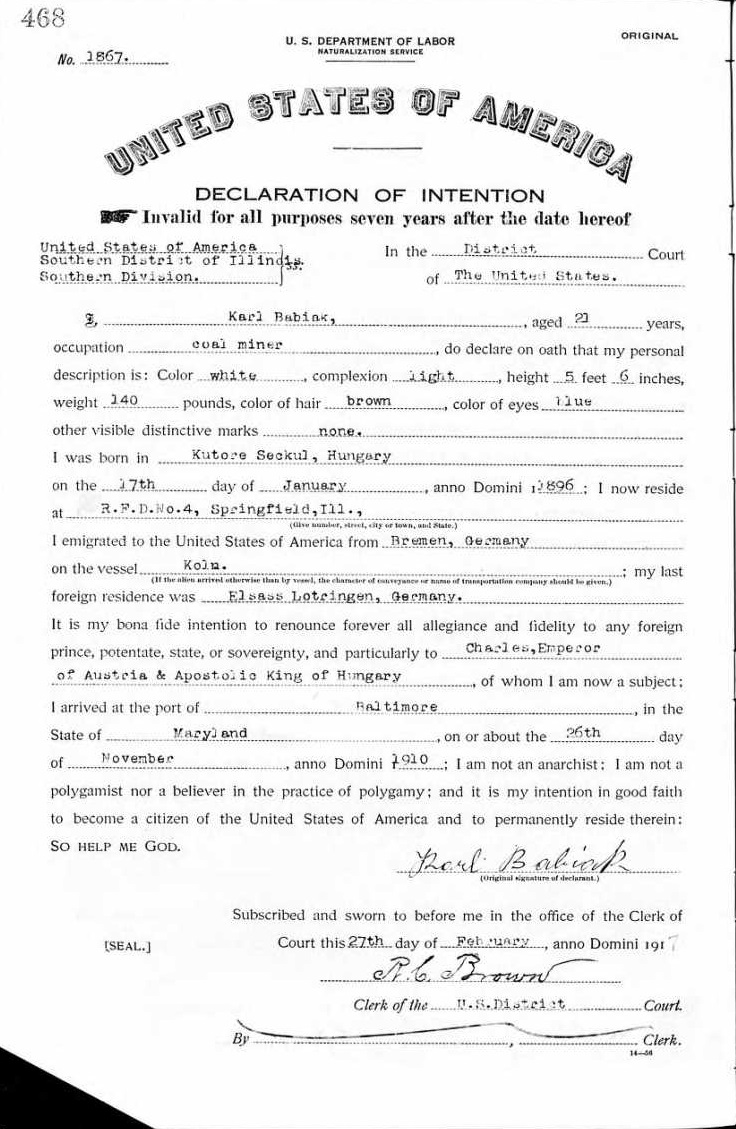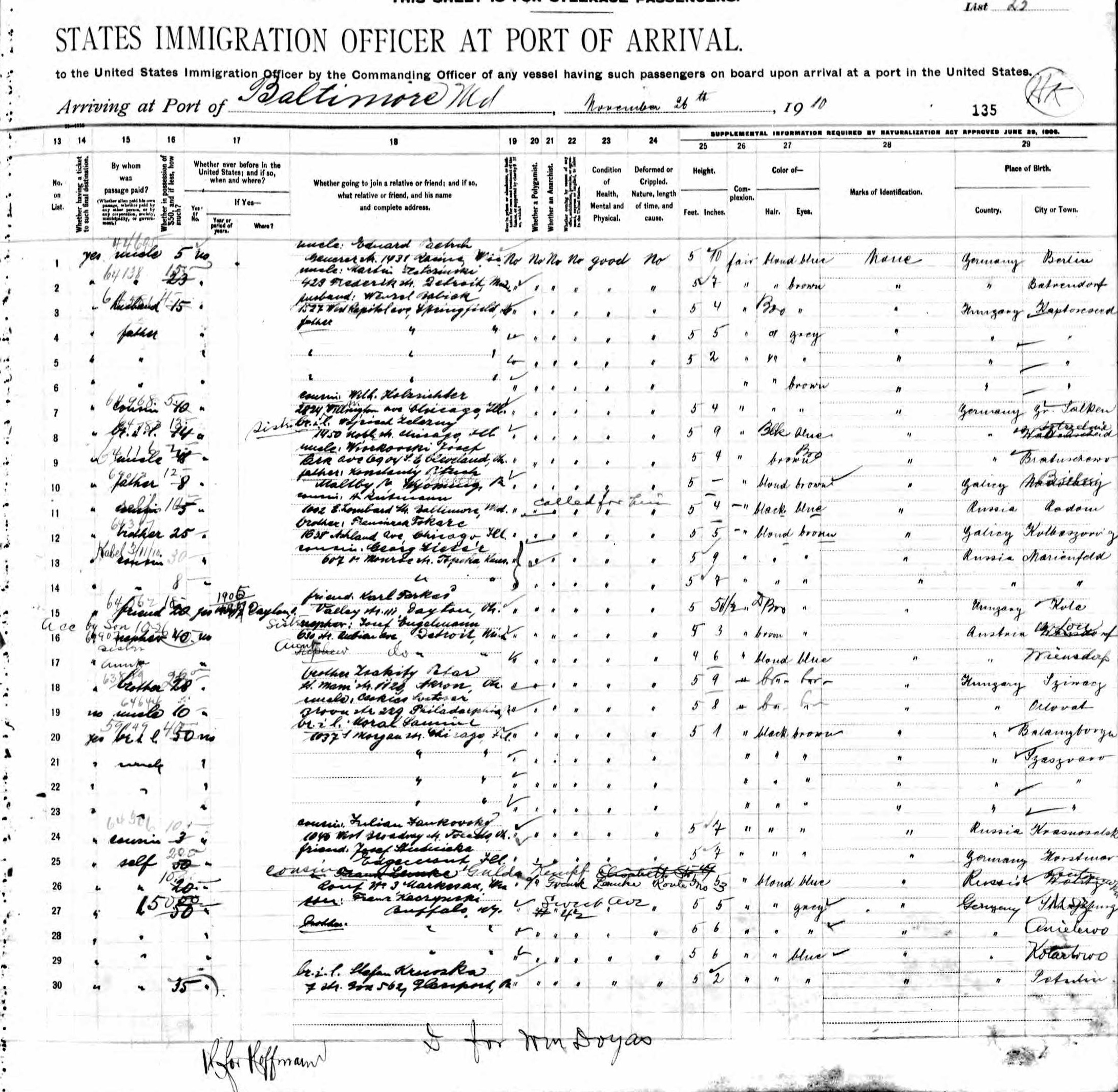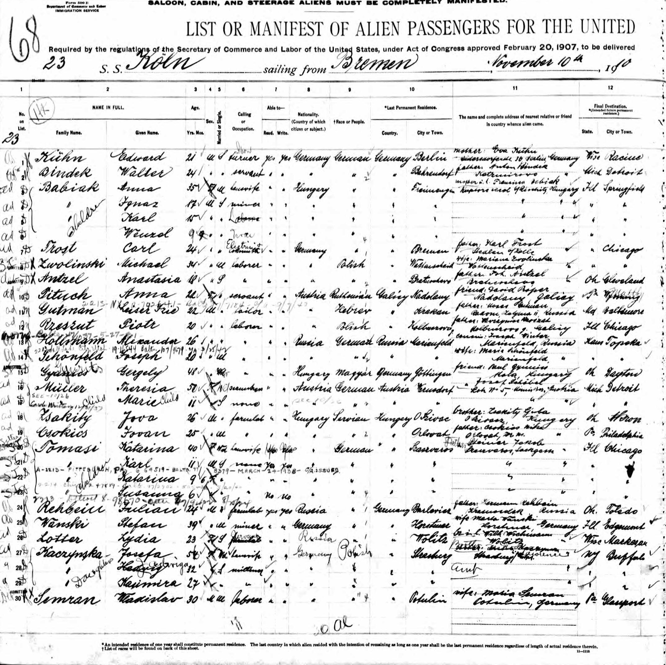 Babiak Family 1910 Arrival Manifest, Lines 3-6