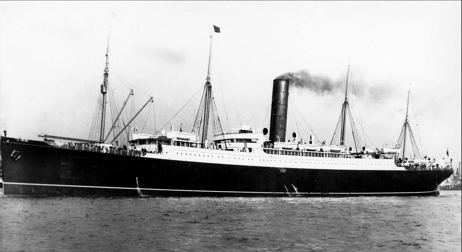 The R.M.S. Carpathia was launched August 6th, 1902 by C.S. Swan & Hunter, Wallsend-on-Tyne for the Cunard SS Company. She sailed her maiden voyage from Liverpool - Queenstown - Boston on May 5th, 1903. From 1903-1905, she was used for many services between Liverpool and Boston, Liverppol and New York, and Trieste and New York. In 1905, she was refitted to carry 100-1st, 200-2nd and 2,250-3rd class passengers. She resumed sailings between Trieste, Fiume, Palermo and New York in October of 1905. On April 18th, 1912, she arrived in New York with 700 Titantic survivors. She commenced her last Piraeus - Messina - Palermo - Naples - Genoa - Lisbon - New York voyage in April of 1915 and was then transferred to the Liverpool - New York service in July 1915. On July 17th,1918, she was torpedoed and sunk by the German submarine U.55, 120 miles west of Fastnet, with the loss of 5 lives.