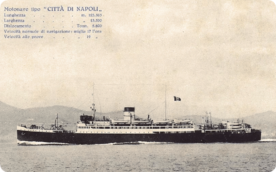 The S.S. Citta Di Napoli was built by Harland & Wolff, Belfast in 1871 as the S.S. Republic for the White Star Line. She was launched on Jul 4th, 1871 and left for Liverpool on her maiden voyage to Queenstown and New York on February 1st, 1872. Her last voyage on this service commenced January 16th, 1889 and was then sold to Holland America Line and renamed S.S. Maasdamn. Re-engined by G.Forrester & Co, Liverpool, and refitted, she started the Rotterdam to New York sailings on March 15th, 1890. March 6th, 1902, she commenced her last voyage between Rotterdam, Boulogne and New York. In 1902, she went to Italian owners and was renamed S.S. Vittoria and later the same year was sold to La Veloce of Genoa Refitted to carry 1,424-3rd class passengers and renamed S.S. Citta Di Napoli. She started sailings between Genoa, Naples and New York on September 30th, 1902. Her thirtieth and last voyage on this route commenced April 27th, 1907. She was sold in 1908 and scrapped in Genoa in 1910.