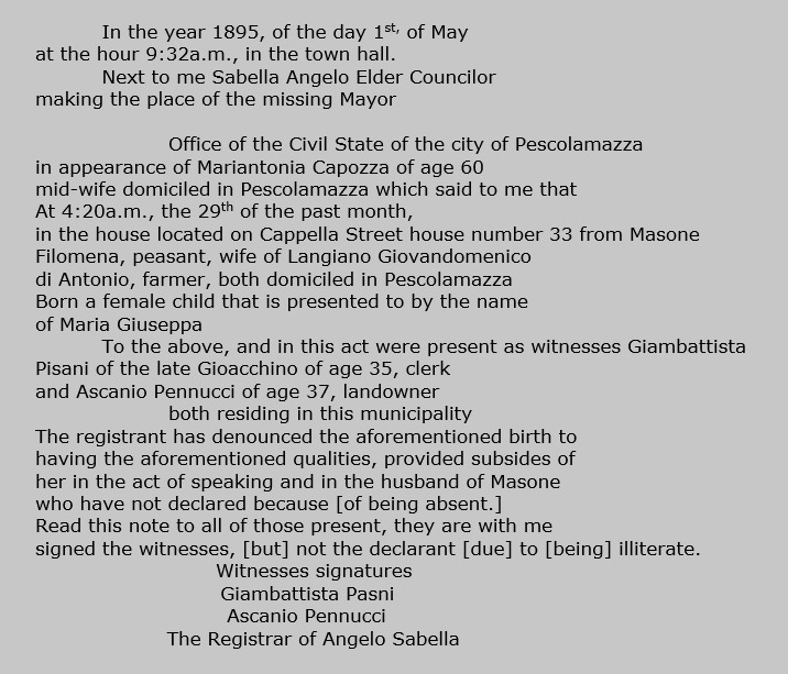 Below is a sample translation of Maria Giuseppa's Italian birth record to English.