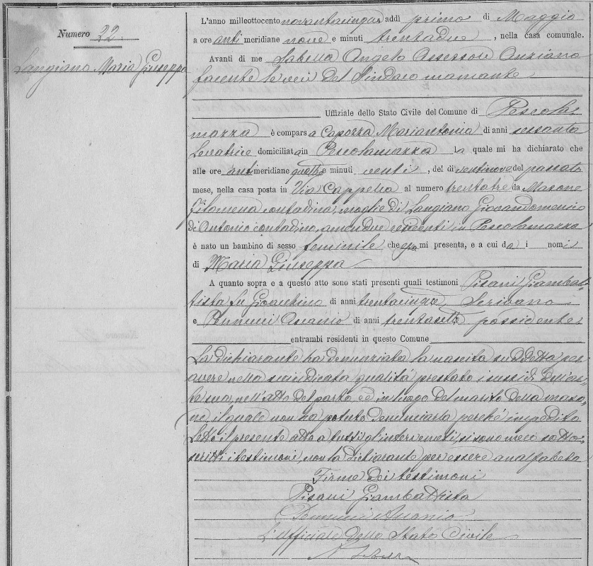 Atti Di Nascita” meaning "Acts of Birth". This sample is of my Great-Aunt Giuseppa Langiano. Italian birth records can look and be worded differently depending on the originating town or “