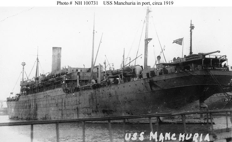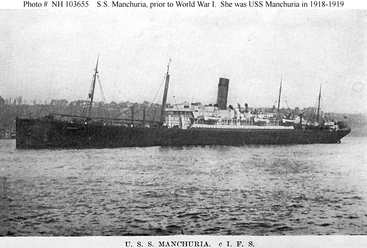The Manchuria was built in 1904 by New York Ship Building Company in Camden, New Jersey for the Pacific Mail SS Company. She was first used for Hong Kong to Yokohama to San Francisco services. In 1916, she was sold to the Atlantic Transport Line. Between 1918 and 1919 the vessel was used as an Army Transport ship. In 1928, it was sold to the Dollar Steamship Line in San Francisco and renamed President Johnson. In 1947, it was sold to Portugal and renamed Santa Cruz and eventually scrapped in 1952.