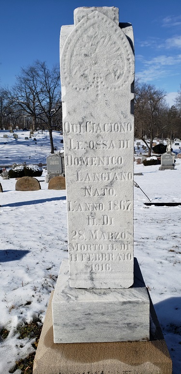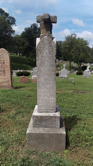 Before she died, I met with my cousin Vicki Langiano to talk the old days and try to obtain more famiy history information. One of the questions I asked her was do you know the location of Domenico's grave. She swore she had been there before and even gave me a brief description of what the grave looked like as far as she could remember. She described it as a tall pedestal grave with a cross on top and rosary beads. She also thought it was in Calvary. Now with a hint more of proof, I decided to take on the tedious task of walking row-by-row looking at every grave in Calvary until I found the one that fit Vicki's description. I recruited my little brother Dylan and we spent about 6 hours on two different Saturday's in the middle of August looking at graves with no luck.