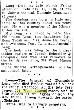 Realizing there had to be an easier way, I hit the newspapers. I was hoping maybe I would get lucky and find an obituary. Using Newspapers.com I searched every which way I could and found absolutely nothing. I then remembered the city directories and how bad the name was mispelled as "Lynch" so I started searching using far-off variations of Langiano/Lanciano. Eureka!! Finally, I had found the obituary hiding under the surname "Leng" and my suspicion was correct He was buried in Calvary Cemetery, but still could not figure out why their registry did not have him listed.
