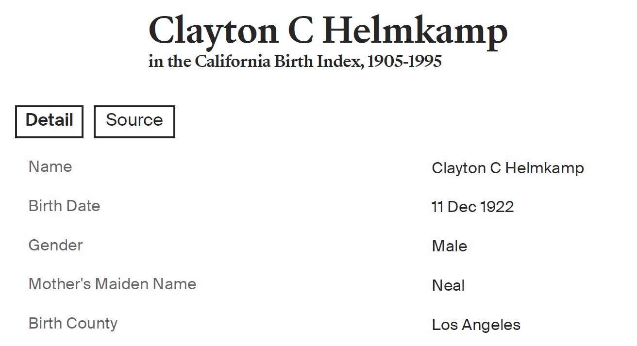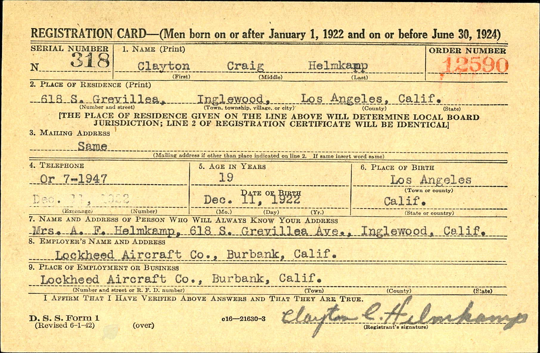 Clayton Craig Helmkamp was born on December 11, 1922 in Los Angeles, California, USA. He and
