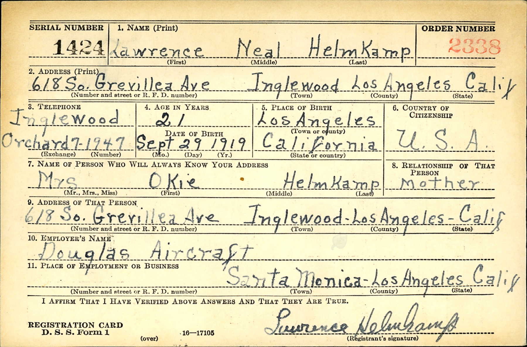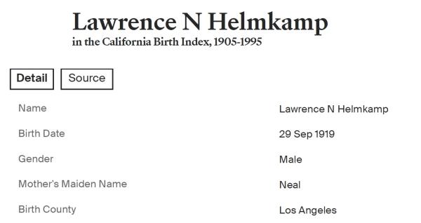 Lawrence Neal Helmkamp was born on September 29, 1919 in Los Angeles, California, USA. He and