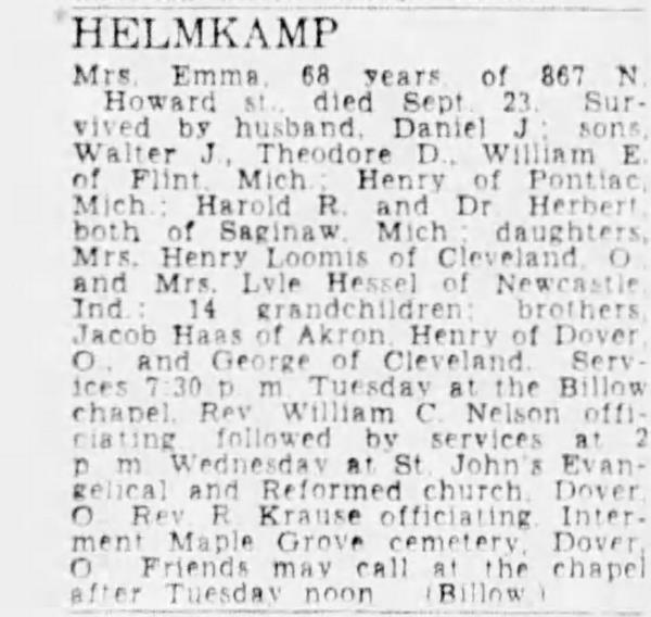 Rev. Daniel John Helmkamp were married on September 26, 1899 in Tuscarawas, Ohio, USA. She died on September 23, 1945, at age 68, in Akron, Summit, Ohio, USA. She was buried in Maple Grove Cemetery, Dover, Ohio.