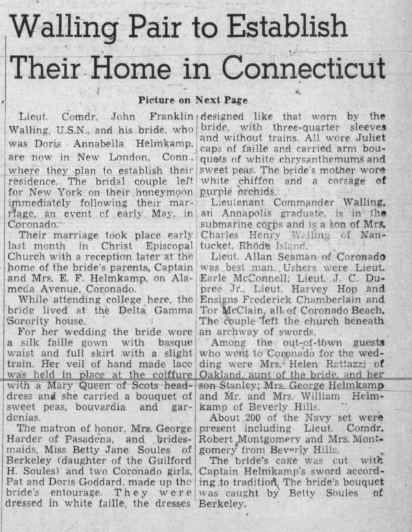 John Franklin Walling were married in May 1943 in Coronado, San Diego, California, USA. She died on December 14, 2000, at age 78, in Alexandria, Virginia, USA. She was buried in Arlington National Cemetery, Arlington, Virginia.