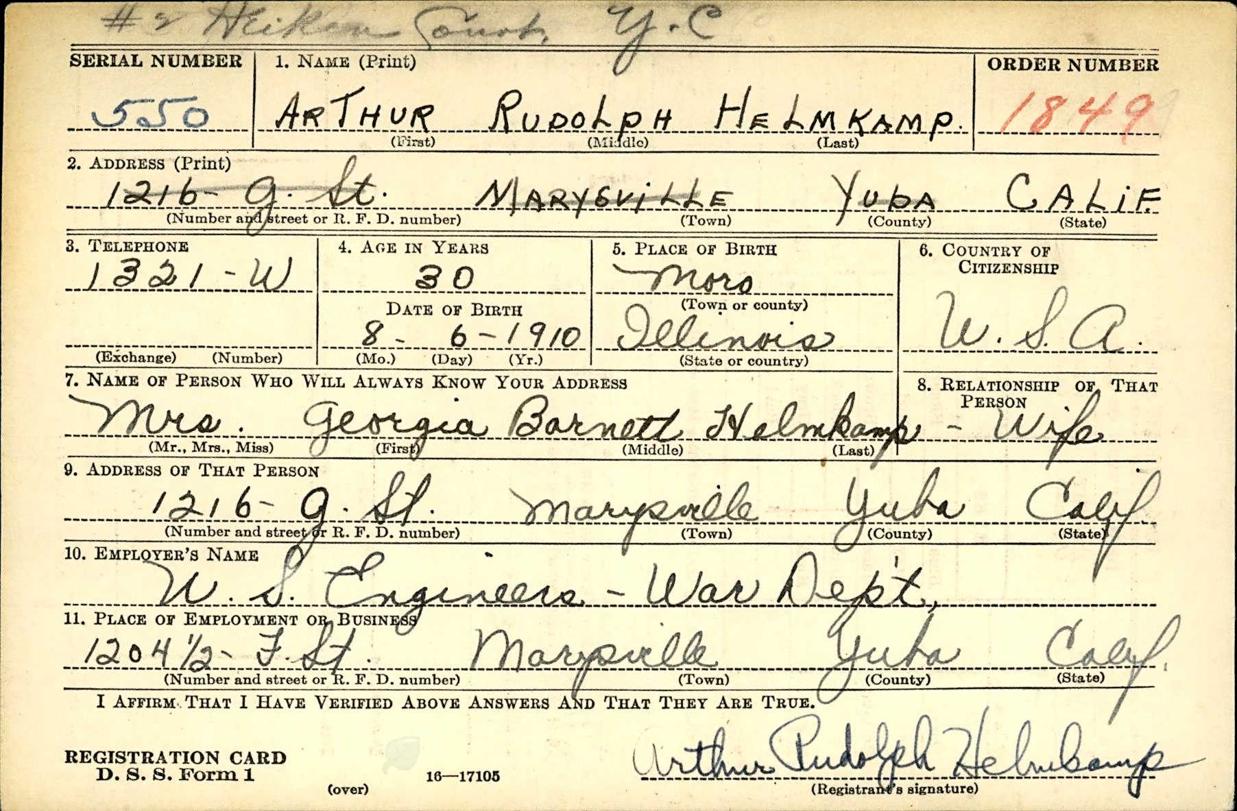 Arthur Rudolph Helmkamp was born on August 6, 1910 in Moro, Madison, Illinois, USA. He died on December 25, 1968, at age 58, in Sacramento, California, USA. He was buried in Sierra View Memorial Park, Olivehurst, California.