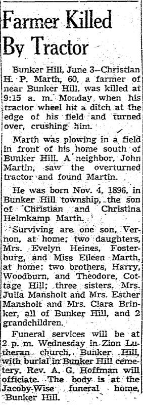 Christian Henry Peter Marth was born on November 4, 1896 in Bunker Hill, Macoupin, Illinois, USA. He died on June 3, 1957, at age 60, in Bunker Hill, Macoupin, Illinois, USA. He was buried in Bunker Hill Cemetery, Bunker Hill, Illinois.